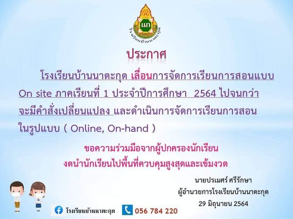 ประกาศโรงเรียนบ้านนาตะกุด เลื่อนการจัดการเรียนการสอน On site ภาคเรียนที่ 1 ประจำปีการศึกษา 2564 ออกไปจนกว่าจะมีการเปลี่ยนแปลง และจะดำเนินการจัดการเรียนการสอนในรูปแบบ Online , On-hand