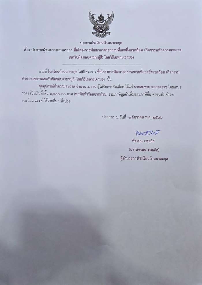 ประกาศผู้ชนะการเสนอราคา ซื้อโครงการพัฒนาอาคารสถานที่และสิ่งแวดล้อม โดยวิธีเฉพาะเจาะจง