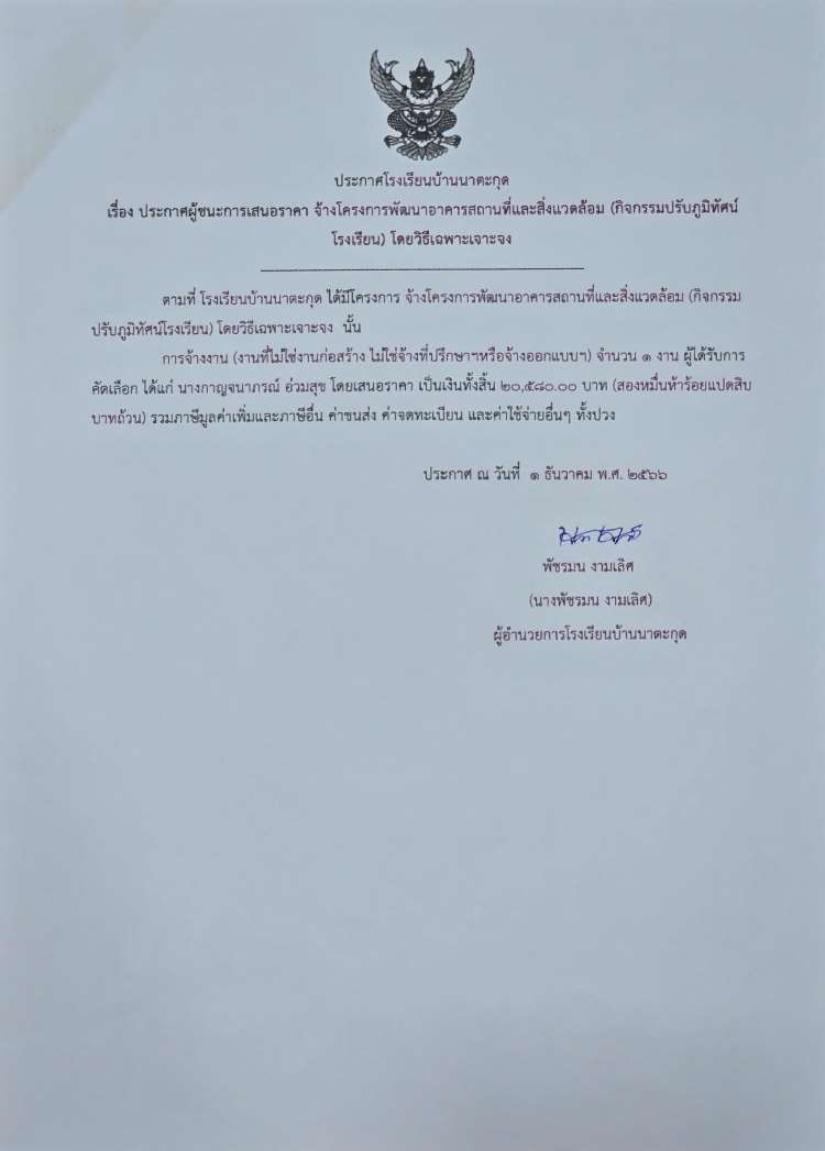 ประกาศผู้ชนะการเสนอราคาจ้าง โครงการพัฒนาอาคารสถานที่และสิ่งแวดล้อม
