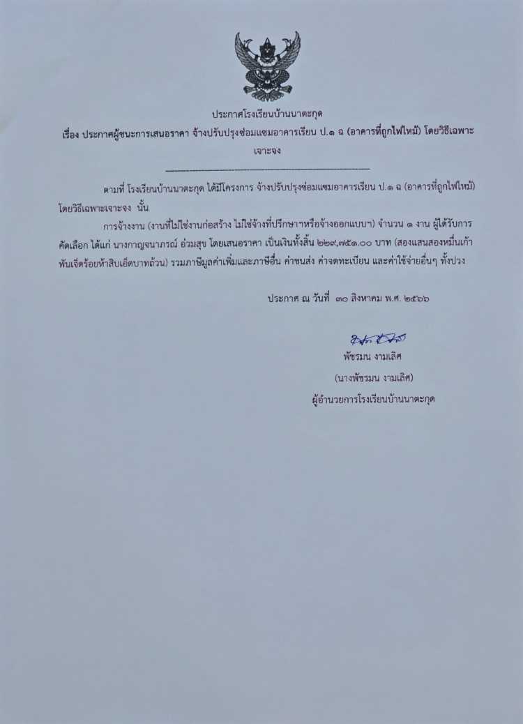 ประกาศผู้ชนะการเสนอราคาจ้างปรับปรุงซ่อมแซมอาคารเรียน ป.1 ฉ