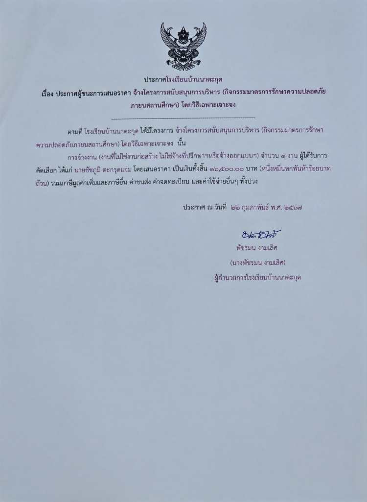 ประกาสผู้ชนะการเสนอราคาจ้างโครงการสนับสนุนการบริหาร (กิจกรรมมาตรการรักษาความปลอดภัยในสถานศึกษา)