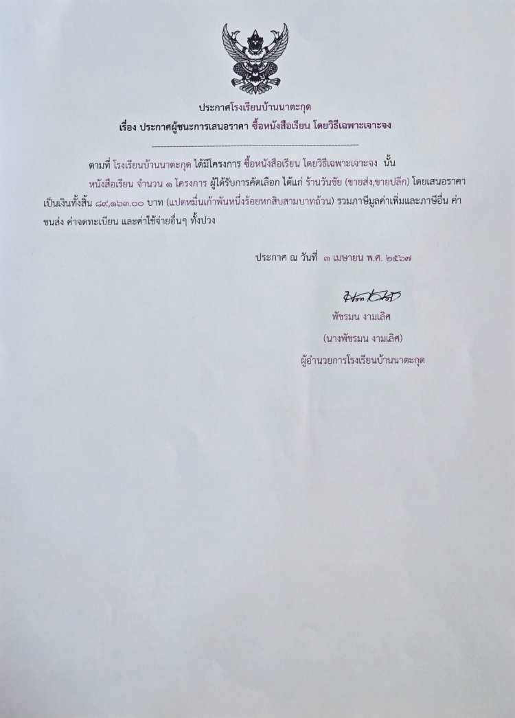 ประกาศผู้ชนะการเสนอราคาซื้อหนังสือเรียน
